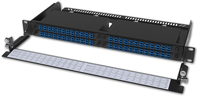 The 144 1ru panel and 96 1ru panel angled high density fixed frames accept up to 4 CMD modules or CMD pass-thru adapter plates for a total of 96FO with LC configuration. This medium density panel is supplied unloaded, with modules and plates supplied separately.